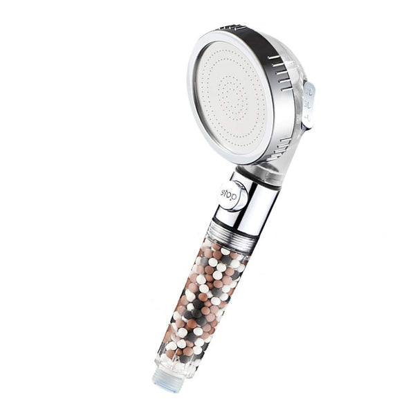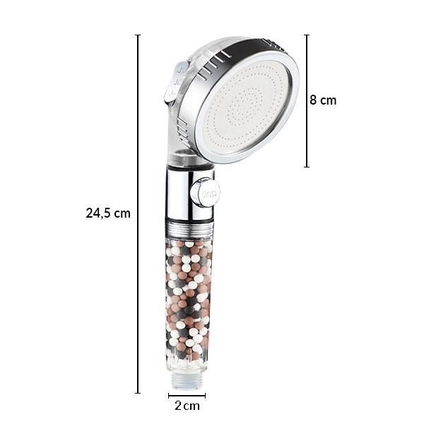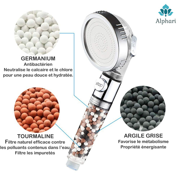 Pour augmenter la qualité de l'eau, les billes dans le pommeau sont composées de tourmalines et d'argiles, permettent de filtrer et de réduire l'acidité de l'eau.